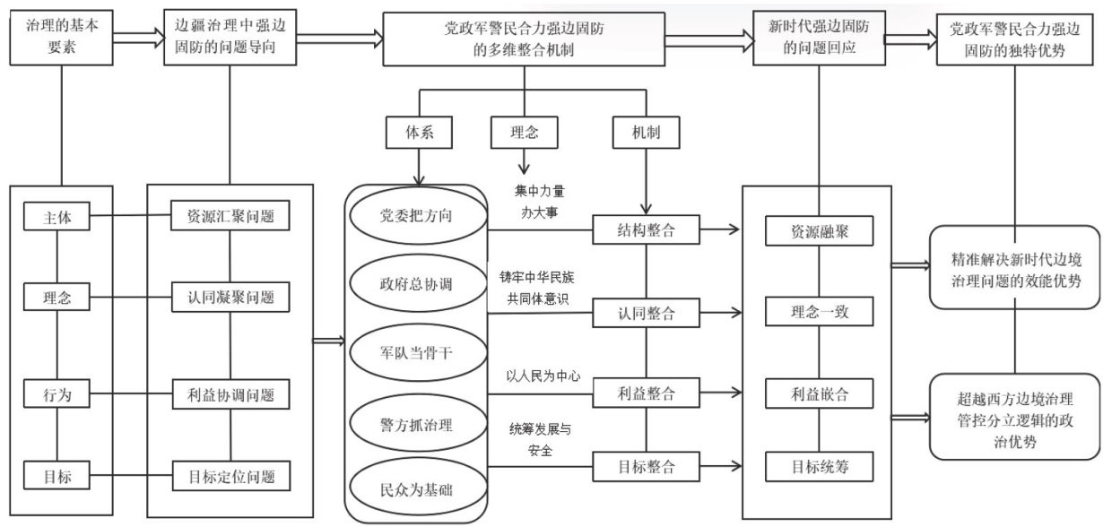 摘要:党政军警民合力强边固防是新时代贯彻落实中国共产党治边方略的重要实践机制,被视为我国边海防的独特优势。把握该独特优势的战略需求与实践机理,有助于深化对边疆治理中国经验的理解。作为新时代边疆治理的重要环节,强边固防领域面临资源汇聚、认同凝聚、利益协调与目标定位等维度的现实问题和整合需求。新时代党政军警民合力强边固防机制坚持问题导向,展现出多维整合的实践机理。在中国共产党的领导下,通过“集中力量办大事”的结构整合、“铸牢中华民族共同体意识”的认同整合、“以人民为中心”的利益整合、“统筹发展和安全”的目标整合等多维整合路径,党政军警民各治边主体形成基于功能关联、理念一致、利益嵌合、目标统筹的一体型协作结构体系。这一结构体系在秩序化运行中有效回应新时代建设强大稳固的现代边海防的战略需求,契合推进边疆治理体系和治理能力现代化的顶层设计。党政军警民合力强边固防的多维整合实践机理超越西方边境治理中国家与社会相对分立的强制管控逻辑,具有显著的政治优势和实践效能优势。完善党政军警民合力治边机制,应当进一步优化多维整合路径,重视发挥“党”与“民”的现实功能。