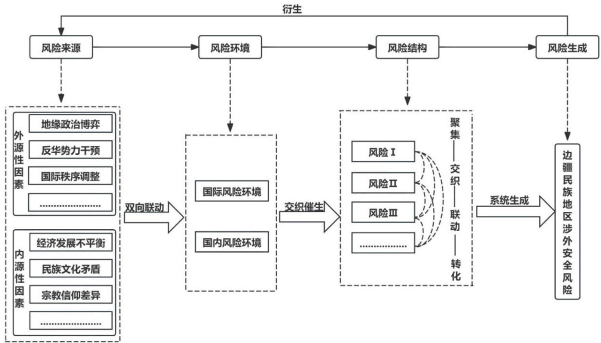 摘要:边疆民族地区是我国对外开放的前沿,时刻面临着复杂多变的涉外安全风险。深度剖析边疆民族地区涉外安全风险的生成机理、类型表征,有助于提出更精准的防控策略,不断完善涉外国家安全机制。边疆民族地区涉外安全风险的生成过程,始于内、外源性风险因素的双向联动,在国际与国内风险环境交织催化的作用下,单一风险发生非线性演变,逐渐聚合为风险复合体,并最终呈现出多维度的特征。基于“两维四分”类型分析法,边疆民族地区涉外安全风险可划分为“输入-显性”型、“输入-隐性”型、“内生-显性”型与“内生-隐性”型,四种风险类型各具鲜明特征及表现形式。面对边疆民族地区涉外安全风险,应从时间、空间与结构三大维度出发,初步构建风险识别机制、风险研判机制与风险处置机制后,进一步构建“时间一空间一结构”三维互嵌的风险协同防控机制,从而筑牢边疆安全稳定屏障,为中国式现代化行稳致远保驾护航。