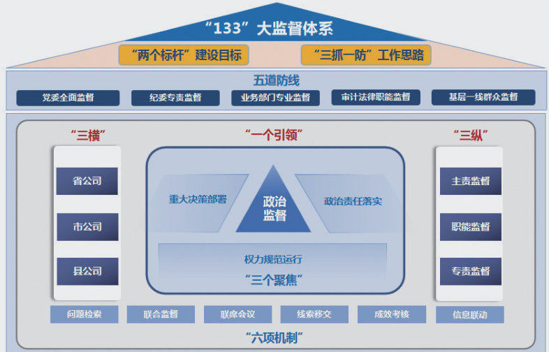 国网冀北电力有限公司深入贯彻新发展理念,牢牢把握监督与合规管理目标一致、功能互补的关系,围绕公司“两个标杆”建设目标和“三抓一防”工作思路,通过构建“133”大监督体系,将监督体制机制建设积极融入企业治理体系,以有力有效的监督举措促进合规管理质效提升,为推动企业现代化治理、践行高质量发展提供坚实保障。 坚持问题导向 强化系统观念 科学构建大监督体系 多年来,冀北公司大兴调查研究之风,通过“走