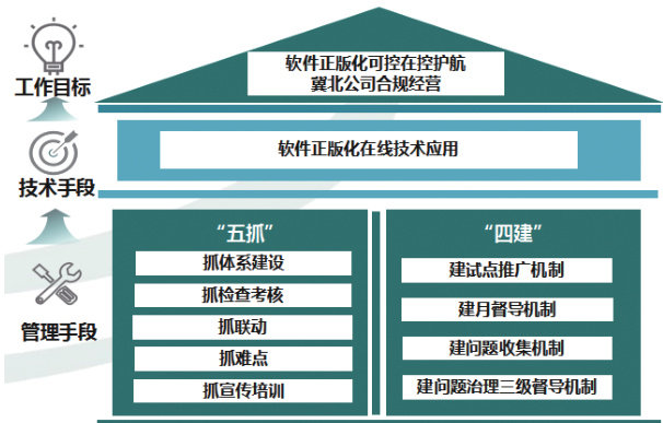 国网冀北电力有限公司认真贯彻落实国家电网公司软件正版化管理工作要求,结合软件正版化合规风险具有分散化、大量化等特点,该公司通过建立“五抓四建”的“技术 + 管理”工作体系,应用数字技术手段研发软件正版化管控工具,自动监控公司各级员工终端安装、使用软件情况,持续推进软件正版化,加强软件资产管理,及时消除违规软件使用风险,护航冀北公司合规经营。 软件正版化在线监测技术应用实施框架 “五抓”夯基