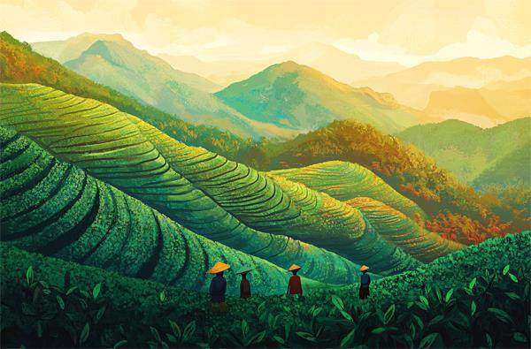 茶花眨着半是好奇半是欣喜的眼眸,身旁的茶树如波浪般逶迤延伸,直至视线的尽头。那嫩叶,已由冬日的黄转为春天的绿,点缀着满山遍野的茶园,一片生机勃勃。她的耳畔,春风轻拂,似乎能听见春天越来越近的脚步声,带着温暖和希望。 采茶的村姑们,三三两两地停歇在茶树旁,如同蝴蝶驻足花间,享受着片刻的宁静。她们的肘间挎着篮子,身旁放着小桶,里面装着从家里带来的简单午餐—— 一碗薯米干饭和两截带鱼头,虽然简单,