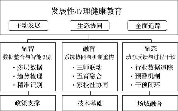 摘要:在大数据驱动教育变革的背景下,传统高中心理健康教育因评估静态化、干预经验化与资源割裂化而暴露适应性不足的问题。基于“发展性心理健康教育”理念,构建“融智·融育·融态”三维数字化转型框架:在“融智”层面,聚焦多源数据融合与个体画像建模,实现心理服务由经验判断向智能决策的跃迁;在“融育”层面,重塑“家校社”协同网络与“三师”队伍,形成支持主体的系统耦合;在“融态”层面,开发过程监测与智能预警系统