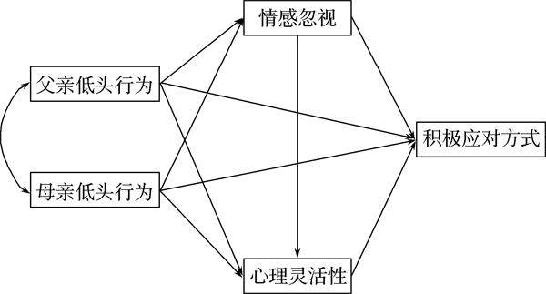 摘要:为考察父母低头行为与青少年积极应对方式的关系及情感忽视和心理灵活性在其中的作用,采用父母低头行为量表、情感忽视量表、青少年回避与融合问卷和简易应对方式问卷对贵州省606名青少年进行调查。结果显示:(1)父亲和母亲低头行为均显著负向预测青少年积极应对方式。(2)父亲和母亲低头行为均通过情感忽视和心理灵活性对青少年积极应对方式产生影响,其中父亲的中介作用包含三条路径:情感忽视独立中介作用、心理灵