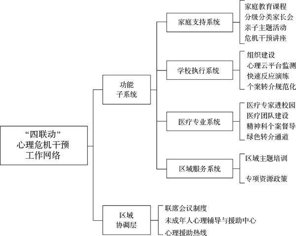 摘要:针对当前中小学生心理危机干预中责任模糊、资源分散、家校医社协同不足等问题,基于系统论整体性思维,通过探索家校医社协同心理危机干预工作机制与体系,建构家校医社协同的“四联动”心理危机联合区域干预模式。实践证明,这种模式能有效提升危机识别与干预的时效性,提高家长的配合度,为区域协同干预提供了可复制的范式。 关键词:系统论;四联动;心理危机干预;区域实践 中图分类号:G44 文献标识码:B