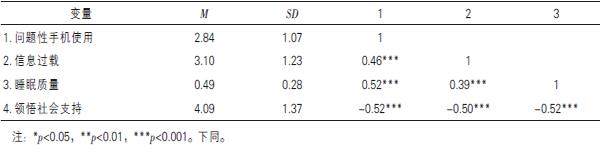 摘要:为探究高中生问题性手机使用对睡眠问题的影响及其作用机制,采用问题性手机使用量表、信息过载量表、匹兹堡睡眠质量指数、领悟社会支持量表对511名高中生进行测验。结果发现:(1)问题性手机使用正向预测高中生的睡眠问题。(2)信息过载在问题性手机使用与睡眠问题间发挥部分中介作用。(3)问题性手机使用对睡眠问题的预测作用受到领悟社会支持的调节。结果表明:问题性手机使用通过提高个体的信息过载水平,从而降
