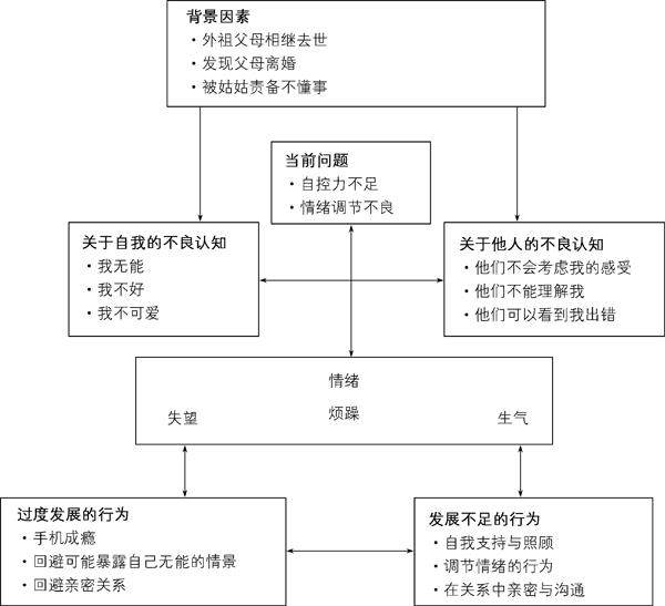 摘要:一名初二学生沉迷手机网游,心理教师采用认知行为疗法对个案的发生背景、当前问题、不良认知、情绪和行为进行分析,形成个案概念化,以此确定辅导目标与计划,通过评估性会谈、咨询性会谈和巩固性会谈对来访进行辅导干预,降低来访使用手机的频率,改善了其手机成瘾行为。 关键词:认知行为疗法;手机成瘾;个案辅导 中图分类号:G44 文献标识码:B 文章编号:1671-2684(2025)27-0053