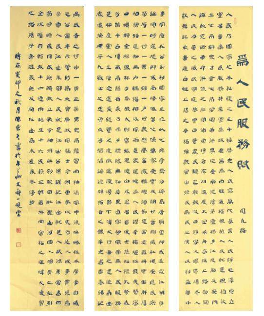 书法:陈东久 陈东久 中国书法家协会会员,中国白石书画院名誉院长。著有《长城唐咏》、《骋怀墨颂》等书法作品集。其巨幅书法作品《为人民服务赋》、《岳阳楼记》、《世界和平赋》、《中华慈善赋》等,分别由中南海、人民大会堂、中华慈善总会等陈列收藏。 人民,乃国家之本,社稷之主。千秋历史人民写,万代基业人民铸。 毛泽东立党名言:“为人民服务”;共产党为政要旨:为百姓造福。根植人民,就是根植沃土;心有