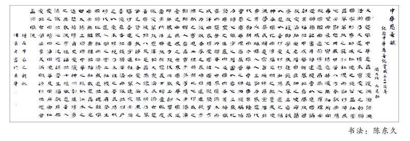 书法:陈东久 闵凡路 新华社高级编辑,《新时代中国赋》编委会主任。曾任《半月谈》杂志总编辑、新华社副总编辑兼国内部主任、《新华每日电讯》总编辑,《中华辞赋》杂志总编辑。获新华社卓越贡献奖。 马建勋 《新时代中国赋》编辑部主任、中华诗词学会理事。在各地报刊发表文字作品数百篇,有多篇辞赋作品在全国征文中获奖。 大国懿风,中华慈善。漫漫渊源,泱泱浩瀚。乃大道之传承,实爱心之彰显。国家形象,功成