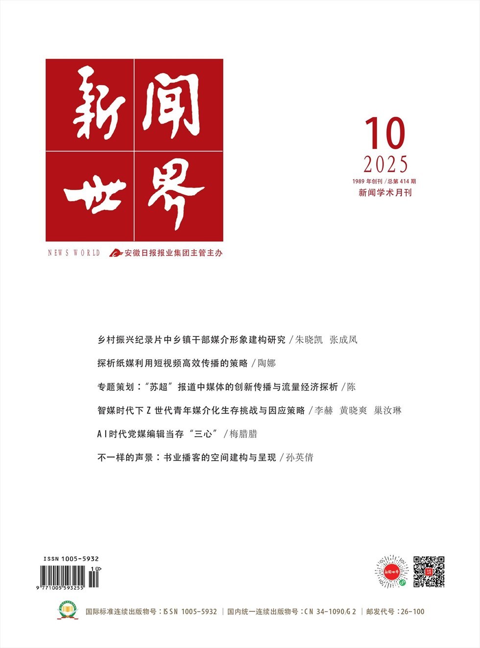 《新闻世界》杂志创刊于1989年,是安徽日报报业集团主管的新闻学术刊物,也是新闻、文化、教育及至社会学界的一份权威性的学术刊物。国际标准刊号:ISSN 1005-5932、国内统一刊号:CN 34-1090/G2,面向国内外公开发行。备注:安徽目前仅限投递合肥、江苏目前仅限投递南京(江宁、仙林、浦口等郊区除外)、江西目前仅限投递南昌、浙江目前仅限投递杭州(萧山区除外)